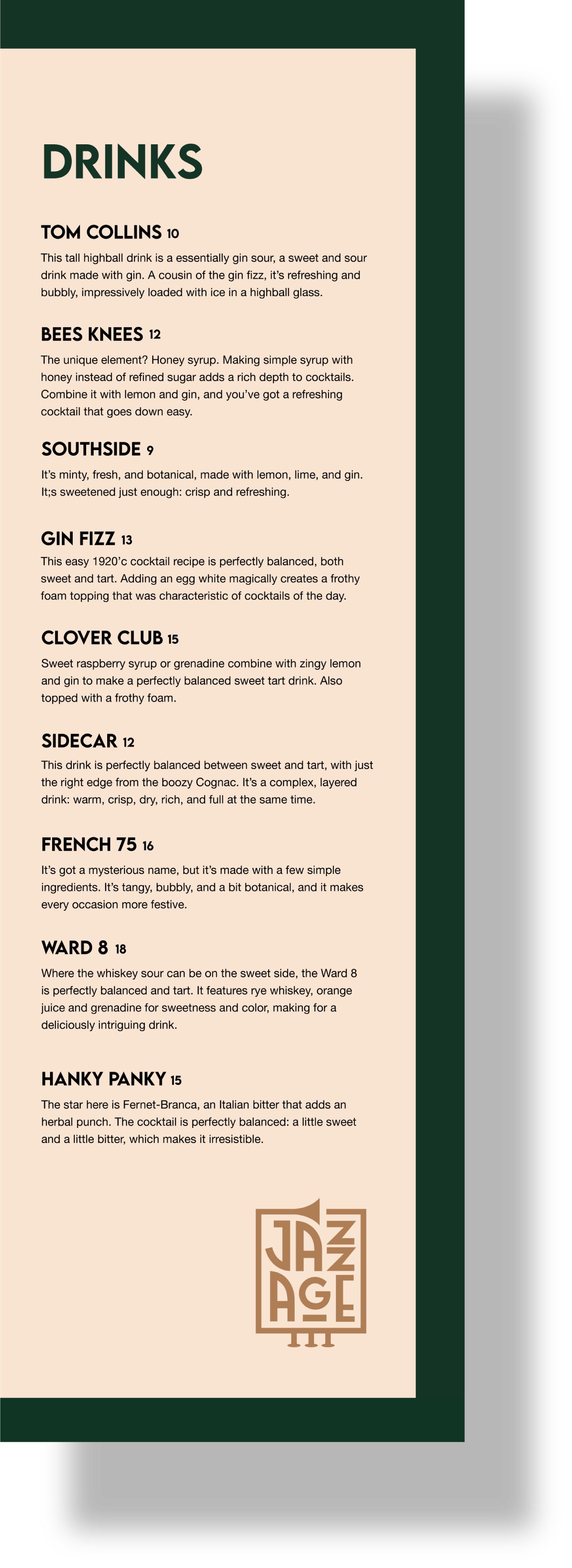 Jazz Age is a fictional speakeasy-themed restaurant and bar in Seattle designed to make you feel like you’ve stepped straight into the 1920’s. Jazz Age is all about bringing people together through live performances, good food, and a lot of theatrical flair.